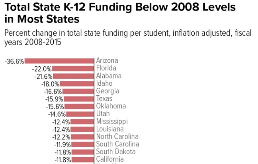STATE EDUCATION CUTS - A recent report out finds that Texas is one of 12 states that have made the deepest funding cuts to K-through-12 education over the past decade. That’s according to the Center for Budget and Policy Priorities which says Texas has cut general funding per student by 16 percent since the 2007-2008 school year. Mike Leachman is the Center’s director of state fiscal research, he says "All 12 of these states are still providing at least 7 percent less formula aid per student in the current school year than in 2008. Four of these states have cut formula funding per student by more than 15 percent - Oklahoma, Texas, Kentucky and Alabama." A significant share of education funding for school districts comes from the state. Leachman says state budget cuts hurt not only students, but the local economy as well. ""As of September 2017,