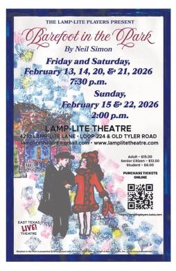 The Lamp-Lite Players present Barefoot in the Park, by Neil Simon, February 13, 14, 20, 21, 2026, at 7:30 pm, and February 15 and 22, 2026, at 2:00 pm.