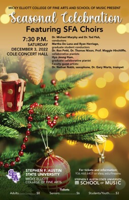 The choirs of Stephen F. Austin State University will ring in the holidays with a “Seasonal Celebration,” a program of beloved Christmas carols and classics, in a concert at 7:30 p.m. Saturday, Dec. 3, in Cole Concert Hall on the SFA campus.