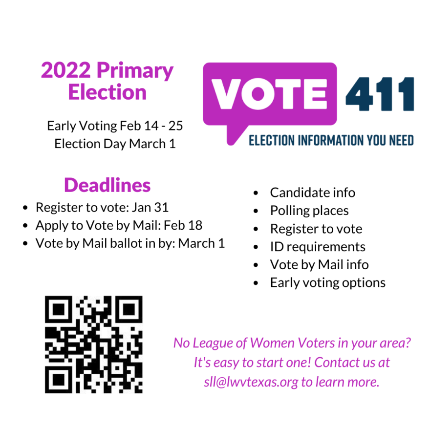 Vote-by-mail applications must be received, not postmarked, by Friday, February 18. Texans who are eligible to apply include those 65 and older, individuals with disabilities, and those expecting to give birth within three weeks before or after Election Day. More information is available online at www.votetexas.gov
