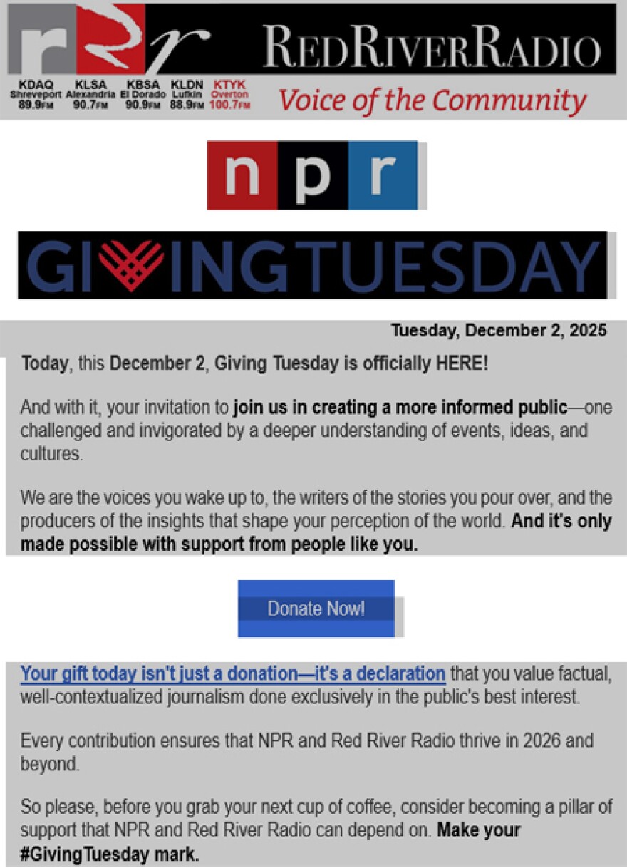 NEWS Giving Tuesday is today! Donate Now Red River Radio Published December 2, 2025 at 10:00 AM CST Facebook Twitter LinkedIn Email Donate now and all contributions will be counted in next week's annual Food Backpack drive. Donate at: https://donate.nprstations.org/rrr/